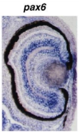 pax6 (paired box 6 ) gene expression in retinal ganglionic cell layer of sectioned Xenopus eye. |