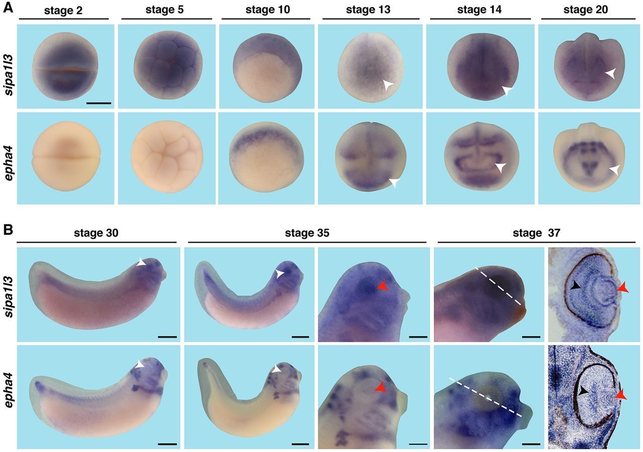 µm. (B) sipa1l3 and epha4 are expressed in the developing eye (white arrowheads) including the retina (black arrowheads) and lens (red arrowheads). Dashed lines in B, stage 37 indicate level of transversal sections. Scale bars: 500â