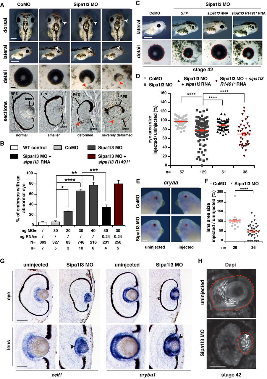 Fig. 2. Sipa1l3 is required for Xenopus ocular development. (A) Loss of Sipa1l3 through injection with Sipa1l3 MO leads to smaller and deformed eyes (white arrowheads) at stage 42, including a disturbed RPE (red arrowheads) in comparison with uninjected side and control MO (CoMO) injected embryos. Scale bars: 500â