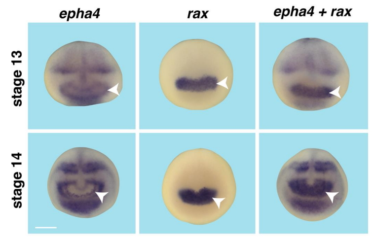 At stages 13 and 14, epha4 and rax showed a partial overlapping expression in the early eye field (white arrowheads). Scale bar: 500µm. |