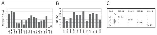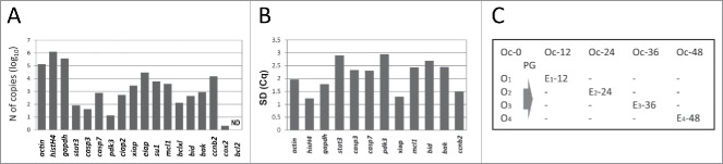 Figure 1. Variability of transcript contents in Xenopus oocytes. (A) Expression levels of 18 genes measured in a single Xenopus oocyte. (B) Standard deviation of gene expression in the oocyte population determined by analyzing expression levels in 16 to 22 individual oocytes. (C) Sampling design of gene expression monitoring in single aging Xenopus oocytes and eggs. Cytoplasmic collections were made from individual oocytes (O1, O2, O3, O4) before PG treatment, then from the eggs derived from these oocytes at 12, 24, 36 and 48 hours after PG addition (E1–12, E2–24, E3–36, E4–48, respectively). Cytoplasmic samples were also taken from a control untreated oocyte at the corresponding times (Oc-0, Oc-12, Oc-24, Oc-36, Oc-48). In panel (A), mRNA levels were measured in 2 to 4 replicates. SDs of replicate measurements are small and not visible in the plot.
