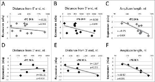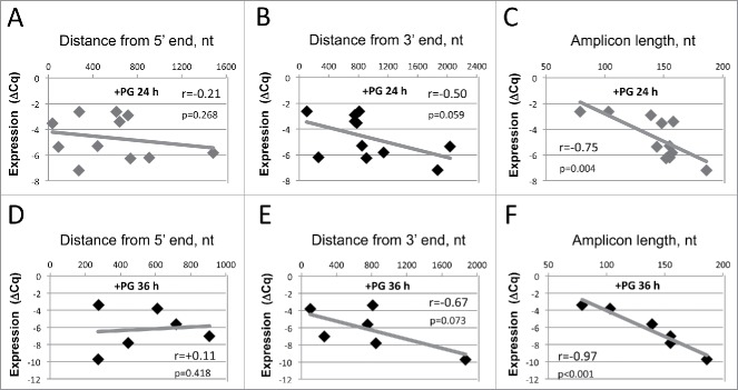 Figure 3. Correlations of ΔCq with amplicon length and position obtained with random hexamer RT primers. The results of pairwise correlation analysis between the decrease in transcript level and amplicon distance from the 5′ end, (A) and (D), amplicon distance from the 3′ end, (B) and (E), and amplicon length, (C) and (F), are presented. The decrease in transcript contents was determined for 11 transcripts at 24 hours after PG administration in panels (A), (B), (C) and for 6 transcripts at 36 hours in panels (D), (E), (F), as described in the legend to Fig. 2. First strand cDNA was generated using random hexamer primers. Calculated values of the pairwise correlation coefficient (r) and one-tailed probability test (p) are indicated in the panels.