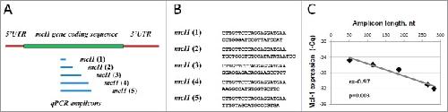 Figure 4. Correlation between Cq and amplicon length in mcl1 gene transcript observed in apoptotic eggs. Positions and sequences of 5′ qPCR primers targeting qPCR amplicons of different length in mcl1 gene transcript are presented in panels (A) and (B), respectively. First strand cDNA was generated with random hexamer primers. The results of pairwise correlation analysis between Cq and amplicon length are shown in panel (C). Calculated values of the pairwise correlation coefficient (r) and one-tailed probability test (p) are indicated in panel (C).