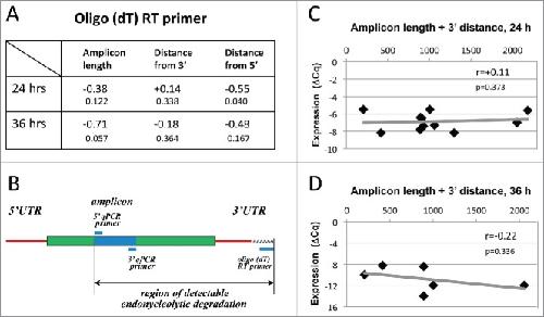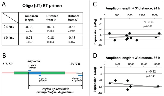 Figure 5. Correlations of ΔCq with amplicon length and position obtained using oligo(dT) RT primers. Panel (A) presents values of the pairwise correlation coefficient (big fonts) and one-tailed probability test (small fonts) determined at 24 and 36 hours after PG administration in the experiments using the oligo(dT) RT primer. Panel (B) specifies the region of detectable endonucleolytic degradation in the used experimental design. The results of pairwise correlation analysis between ΔCq and combined length of amplicon plus its distance from the 3′ mRNA end determined for 11 transcripts at 24 hours and for 6 transcripts at 36 hours after PG administration are presented in panels (C) and (D), respectively. Calculated values of the pairwise correlation coefficient (r) and one-tailed probability test (p) are indicated in the panels.