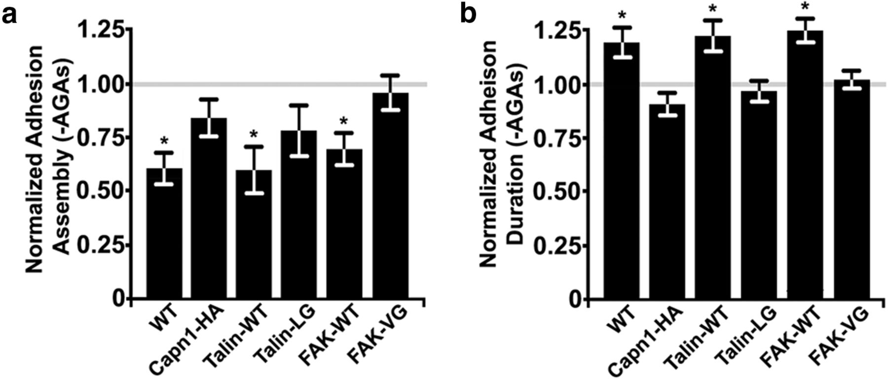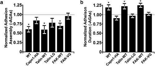 The effects of filopodial Ca2+ transients on adhesion dynamics are blocked by inhibition of calpain activity and cleavage of talin and FAK. a, b, Change in growth cone adhesion assembly rate (a) and adhesion duration (b) after disinhibition of filopodial Ca2+ transients by removing AGAs in wild-type-, capn1-H272A-, talin-WT-, talin-L432G-, FAK-WT-, and FAK-V744G-expressing growth cones in vitro. Paired measurements were made from the same growth cones before and after the removal of AGAs, and data were normalized to the rate of adhesion assembly and duration in normal culture conditions. Statistical comparisons were made within the same growth cones before and after the removal of AGAs within each group. For each group, n > 110 individual adhesions and n > 10 growth cones. *p < 0.05, Mann–Whitney U test or Student's t test. |