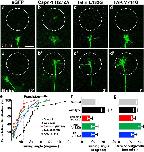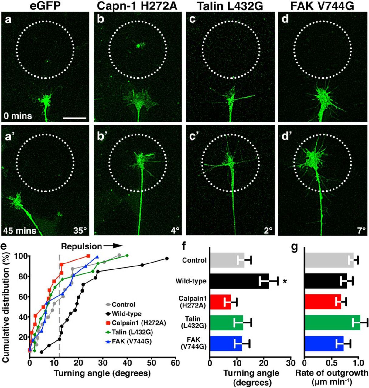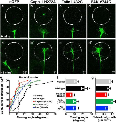 Stimulation of filopodial Ca2+ transients causes repulsive turning through calpain-mediated cleavage of talin and FAK. a, aâ², Two time-point images of a GFP-expressing growth cone loaded with NP-EGTA undergoing repulsive turning from an area exposed to pulsed UV light (dashed circle) at 10 s intervals. bâd, Two time-point images of growth cones loaded with NP-EGTA and expressing GFP-capn1-H272A (b), GFP-talin-L432G (c), or GFP-FAK-V744G (d) show no repulsive turning to pulsed UV light after 45 min of outgrowth. e, Cumulative distribution of all axon turning angles for control (no NP-EGTA, gray), NP-EGTA loaded wild-type-, capn1-H272A-, talin-L432G-, or FAK-V744G-expressing growth cones. The vertical dashed line represents the mean turning angle for the control growth cones. f, g, The mean turning angle (f) and the mean rate of outgrowth (g) for each condition. Scale bar, 5 μm. n > 10 growth cones for each condition. *p < 0.05, KruskalâWallis with Dunn's multiple-comparison test. |