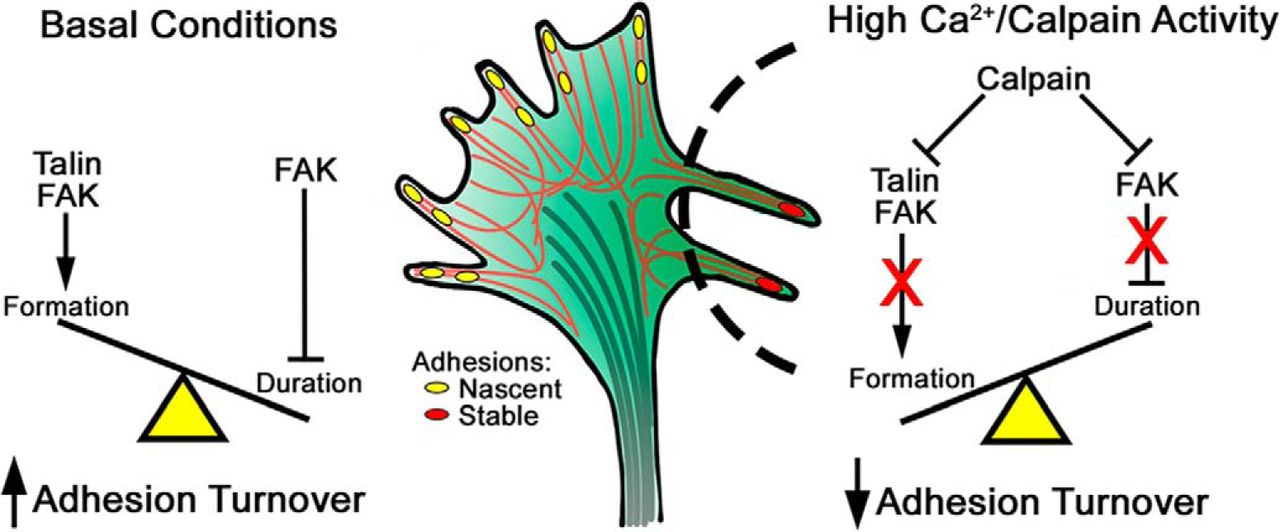 Ca2+/calpain regulation of adhesion dynamics and growth cone motility. Growth cones exhibit repulsive turning from local Ca2+ elevations in filopodia. Under basal conditions in our experiments, talin and FAK promote integrin-based adhesion formation, while FAK promotes the disassembly of adhesions to maintain consistent adhesion turnover. Local Ca2+ elevations (dashed lines) in response to repulsive axon guidance cues (presumed) or uncaging of Ca2+ in filopodia (this study) activates calpain. Filopodial calpain activity cleaves talin and FAK to prevent adhesion formation and turnover, and tips the balance between formation and duration that results in Ca2+-dependent repulsive turning. |