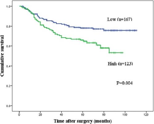 Fig. 3. Kaplan-Meier curves for the disease-specific survival (DSS) of patients with targeting protein for Xenopus kinesin-like protein 2 (TPX2) expression. Patients with high TPX2 protein expression (n = 123) had significantly poorer DSS than those with low TPX2 expression (n = 167; p = 0.004)