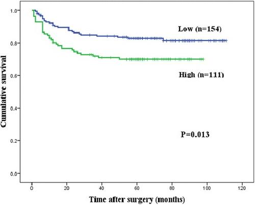 Fig. 4. Kaplan-Meier curves for the relapse-free interval (RFI) of patients with targeting protein for Xenopus kinesin-like protein 2 (TPX2) expression. Patients with high TPX2 protein expression (n = 123) had significantly poorer RFI than those with low TPX2 expression (n = 167; p = 0.013)