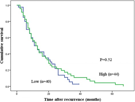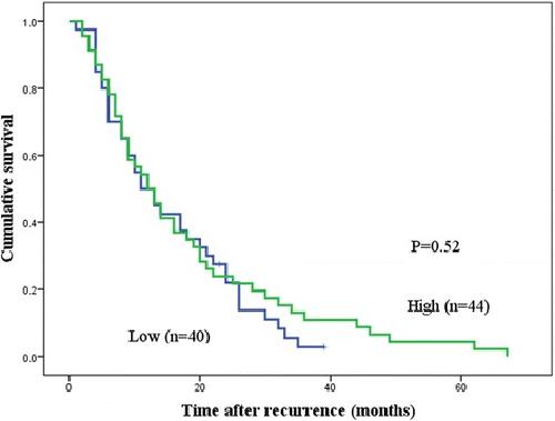 Fig. 5. Kaplan-Meier curves for disease-specific survival (DSS) after recurrence of patients with low or high levels of targeting protein for Xenopus kinesin-like protein 2 (TPX2) expression. The log-rank test showed no significant difference between DSS and TPX2 expression in patients after recurrence (p = 0.52)