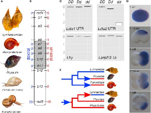 Figure 1. Mapping the Formin Gene, Maternal Expression, and Evolution of Chirality(A) The snail genera used in this study (image credits: Lymnaea [E. de Roij], Biomphalaria and Physa [creative commons], Partula and Euhadra [A.D.]).(B) 3,403 offspring were used to infer the recombination breakpoints that bound the D locus. Numbers of mapped recombinants for 1,507 sinistral (dd) snails are shown on the right and for 1,896 dextral (DD or Dd) on the left. The sinistral mutation must be between loci b6 and b12 (shaded), a region that spans 267 kb (not to scale).(C) Boxplots show normalized relative quantities (NRQs), on log scale, of quantitative real-time PCR assays of transcripts of three candidate genes and one control (Larp2/3 1a) in single-cell egg samples from dextral homozygote (DD), dextral heterozygote (Dd), and sinistral recessive homozygote (dd) individuals. Significant differences in expression were detected for Ldia2 only (DD:dd, p = 0.002; DD:Dd and Dd:dd, p = 0.004).(D) WMISH of maternal Ldia transcripts in early, dextral L. stagnalis embryos.(E) Schematic showing two hypotheses for the evolution of chirality in three snail families (dextral = blue; sinistral = red). Either sinistrality evolved once from a dextral ancestor, with the ancestral Lymnaeid reverting to dextral (bottom), or sinistrality evolved twice (top).See also Table S1 for the mapping data; Figure S3 for further WMISH and quantitative real-time PCR data; and Figure S2C for the full snail phylogeny.