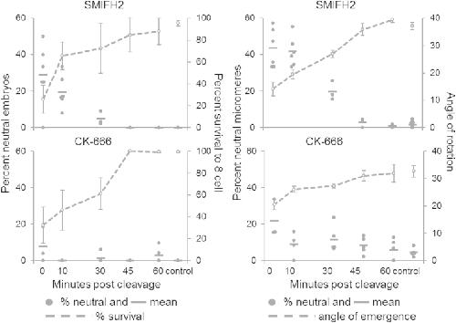 Figure 2. Impact of Drug Treatment upon 4-Cell Snail EmbryosWhen applied shortly after the second cleavage had completed, both SMIFH2 and CK-666 reduced the proportion of embryos that survived to the 8-cell stage (left-hand graphs). Following SMIFH2 treatment (top left), a high proportion of the viable embryos emerged neutrally, without a chiral twist. In contrast, the proportion of neutral embryos following CK-666 treatment (bottom left) was low. Both drugs reduce the angle of rotation as the micromeres emerge (right-hand graphs). Mean values for each experiment and SE are shown. See also Table S2 and Movie S1.