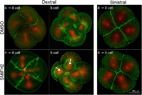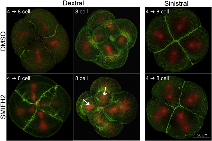 Figure 3. Tubulin and Actin Staining of Control and Drug-Treated EmbryosEmbryos were fixed and stained with Cy3-b-tubulin (red) and 488-phalloidin (green) to highlight the spindle microtubules and filamentous actin, respectively. DMSO-treated embryos predominantly showed spindle inclination (left image, 4-cell stage), with the micromeres usually emerging with a dextral twist (right image, 8-cell stage). A minority of SMIFH2 treated embryos had mitotic spindles that showed a radial orientation (left image), an arrangement that was not observed in DMSO control dextral embryos. In the SMIFH2 right-hand image (8-cell stage), the top middle and middle left micromeres are emerging neutrally (arrows), with the other two showing a partial rotation. Addition of SMIFH2 did not influence spindle orientation in 4-cell DMSO control or sinistral embryos, with spindles typically showing a radial orientation.