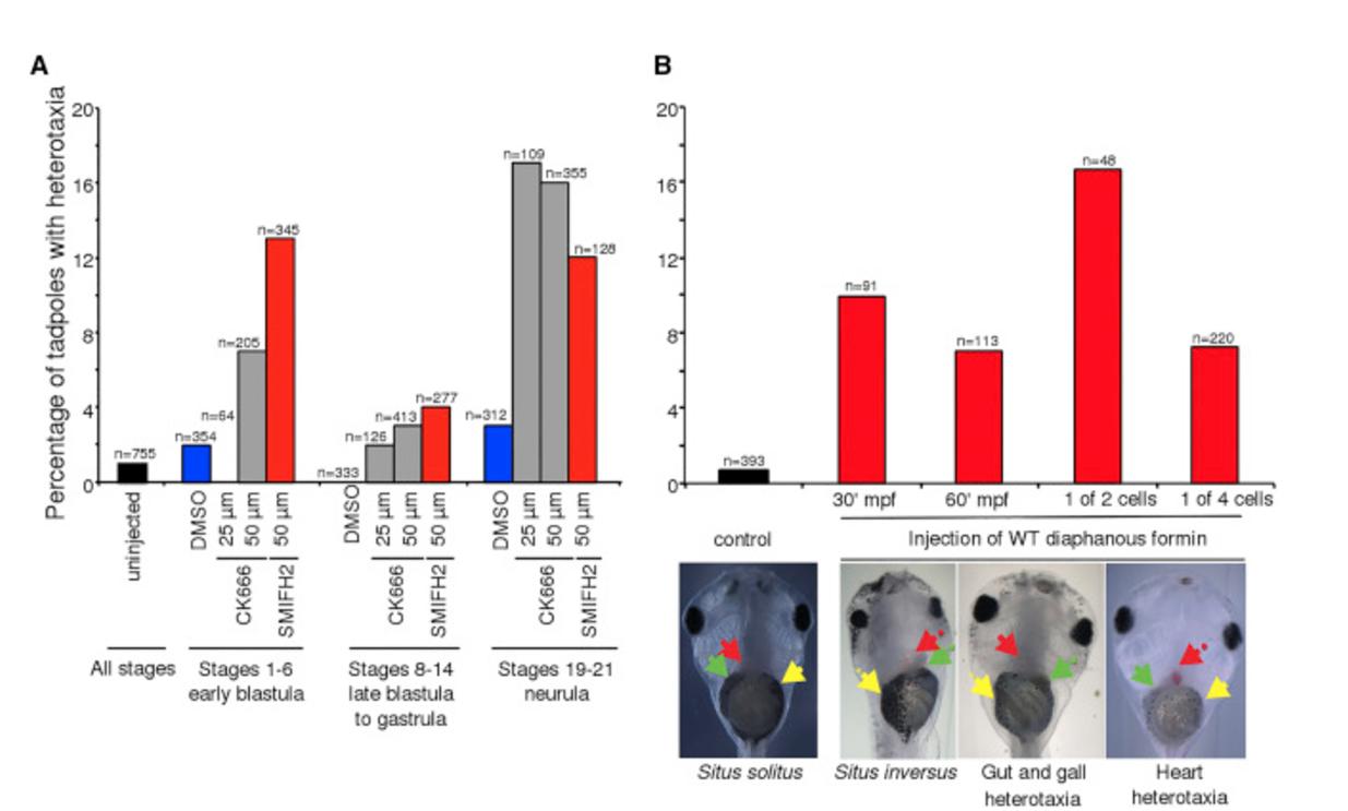 (A) Embryos were treated with DMSO, CK-666, or SMIFH2 at the concentrations indicated, allowed to develop, and scored for visceral organ chirality at stage 45.
