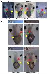 (yellow arrowhead), heart apex (red arrowhead), and gall bladder (green arrowhead). Heterotaxic tadpoles