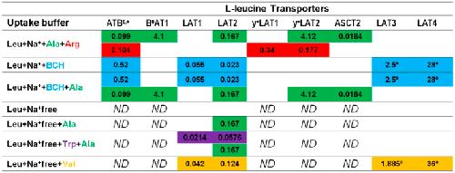 Figure 2. Inhibition of L-leucine transporters in tested uptake buffers.L-leucine (Leu) uptake was tested in buffers containing 10 mM added competitors (BCH or amino acids). The Leu transporters (AATs) with affinity (Km (mM) values shown in Table 1) for the added competitors are indicated in the filled cells of the same color as the text for the named competitors. For Na+free uptake buffers, the Na+-dependent Leu AATs (i.e. require Na+ for Leu uptake) are indicated by ND. Additionally, responses of the Leu transporters for the competitor listed first for each uptake buffer are shown in the upper row and for the competitor listed second are shown in the lower row of filled cell(s). Clear boxes indicate AAT Leu uptake is unchanged due to addition of the indicated competitor and are used for AATs that transport Leu with affinities listed in Table 1 but do not transport the added competitor. aKm (mM) value is for low affinity kinetic component.