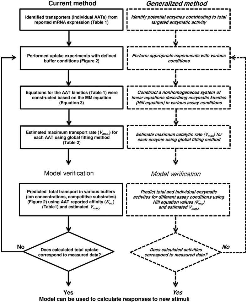 Figure 1. Diagram of the method used for quantifying activity of specific transporter species.The left panel is a schematic of the steps taken in the current study to establish and verify the method for amino acid transport in Xenopus laevis oocytes. AAT refers to Solute Carrier amino acid transporters for L-leucine and L-phenylalanine. The source for the mRNA expression data was Xenbase as described in Methods and Results. Uptake assay protocols are described in Methods. Defined uptake buffers are described in Methods, Results, and Fig. 2. The input parameters for the calculations are given in Table 1. The rationale for the specific equations used to construct the current model are given in the methods. The right panel is a generalized series of steps that could be applied to any system where the kinetics of each active enzyme species can be represented by the Hill equation.