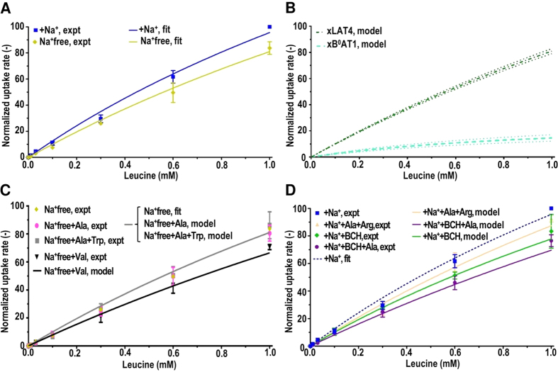 Figure 3. L-leucine uptake by endogenous Xenopus laevis oocyte transporters.Three minute uptakes by non-injected (NI) oocytes of 10–1000 μM L-leucine (Leu) in uptake buffers containing (+Na+) and without sodium (Na+free) were tested using radiolabeled amino acid (AA) tracers. In all panels uptake data (pmol/3 min per oocyte) were normalized to uptake in 1 mM Leu, +Na+ uptake buffer for each batch of oocytes and experimental day. Panel (A) shows normalized Leu uptake rate data (expt) vs. the simultaneous fit (fit) for endogenous Leu uptake rates. Panel (B) shows model calculations (model) for contributions to uptake of 10–1000 μM Leu by various endogenous Xenopus laevis oocyte (xAAT) species. Model output was calculated based on the calculated xAAT Vmax,i and the reported Km for each xAAT ortholog (Table 1). The 95% confidence limits for transporter activities are shown (dotted lines) bracketing the model predictions. Panels (C,D) show the calculated Leu uptake rates in +Na+ and Na+ free uptake buffers containing excess competitive inhibitors. Panel (C) shows the concentration dependence (0–1000 μM Leu) of normalized cumulative uptake data by NI oocytes in Na+free uptake buffers containing 10 mM each of the following competitors: L-alanine (Ala) (Na+free+Ala), Ala and L-tryptophan (Trp) (Na+free+Ala+Trp), L-valine (Val) (Na+free+Val) vs. calculated cumulative endogenous uptake results for the respective uptake buffers. For uptakes in Na+free+Ala, and Na+free+Ala+Trp uptake buffers, the calculated values were virtually indistinguishable from the global fit for the Na+free data, therefore a single line was used for graphing all three data sets. Panel (D) shows the concentration dependence (0–1000 μM) of total Leu uptake rates in +Na+ uptake buffers containing 10 mM each of the following competitors: Ala, Arg (+Na++Ala+Arg), 2-aminobicyclo-(2,2,1)-heptane-2-carboxylic acid (BCH) (+Na++BCH), and BCH and Ala (+Na++BCH+Ala) (Fig. 2). n = 6–8 ooyctes each experiment, for 3 independent experiments. The experimental data are shown as the mean ± SEM for the measured uptake rates and the calculated cumulative endogenous uptake rates were based on the previously calculated Vmax and reported Km values for the kinetic components exhibited by each AAT species (Table 1).