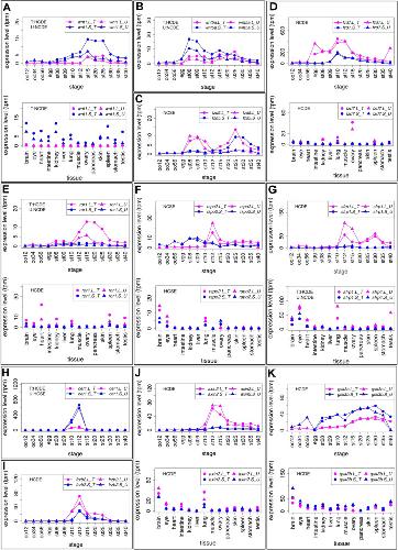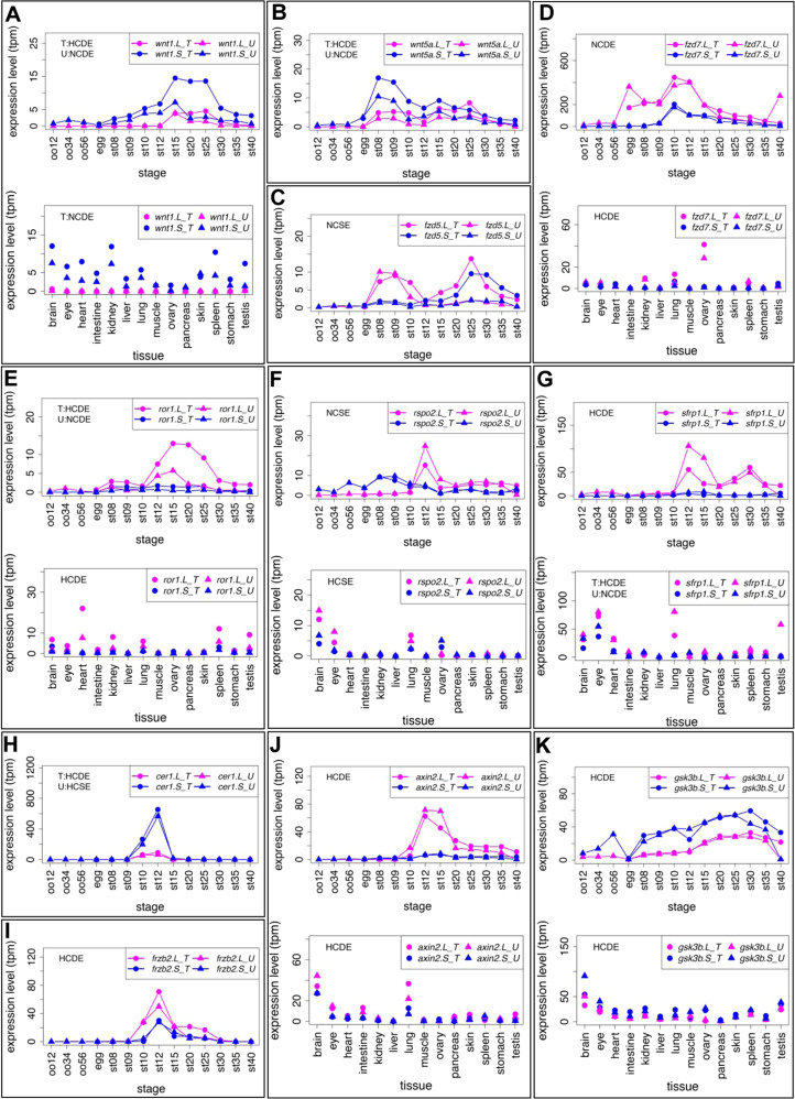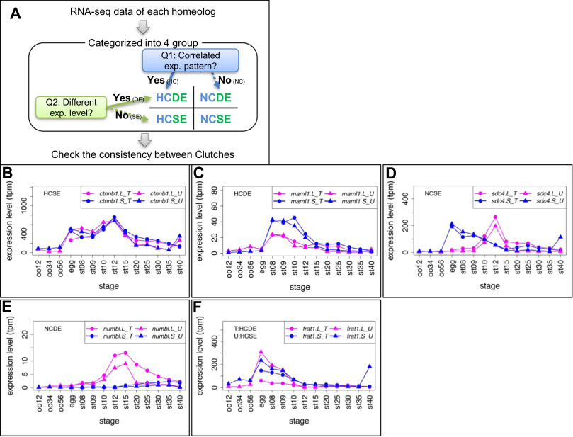 Criteria and examples of transcriptome correlation analysis. (A) Criteria for categorization of homeologous gene expression. See Materials and Methods for details. All results are presented in Suppl. Data3. (B-E) Examples of four groups. Group names are presented in each graph. In case of inconsistencies, group names in different clutches are presented separately. (B) ctnnb1.L (β-catenin.L) and ctnnb1.S (β-catenin.S) showed quite similar expression patterns (HCSE). (C) maml1.L showed highly correlated, but stronger expression than maml1.S throughout developmental stages (st8-12) (HCDE). (D) sdc4.L and sdc4.S showed different expression patterns during development (NCSE). (E) numbl. L showed stronger expression than numbl.S and the two expression patterns are quite different throughout developmental stages. (F) An example of inconsistent categories between clutches. frat1.S was expressed at higher levels than frat1.L during development in Clutch T (HCDE), but both showed similar expression levels in Clutch U (HCSE). Line graphs show expression levels of genes during oogenesis and embryogenesis. Magenta, L genes; Blue, S genes; circles, Clutch T; triangles, Clutch U. |