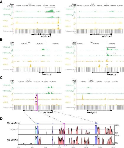 Correlations of epigenetic states and variable expression profiles. (A-C) Genome browser representations of ChIP-seq and DNA methylation data using X. laevis gastrula embryos (st10.5) demonstrated biased enrichment of H3K4me3 and p300 between homeologous genomic regions near axin2, cer1, and sfrp1. ChIP-seq results from biological replicates are shown separately. Green, H3K4me3; yellow, p300; gray, DNA methylation; bracket, strong enrichment of H3K4me3 on the promoter of the more strongly expressed homeolog; arrowhead, strong enrichment of p300 on enhancers of the more strongly expressed homeolog. (D) A vista plot represents sequence conservation in the genomic region around sfrp1 in X. laevis and X. tropicalis. The sequence of sfrp1.L was used as a reference. Light blue, UTR; dark blue, coding sequences; orange, conserved non-coding sequences. Dashed lines and magenta boxes in (C) and (D) correspond to each other. |