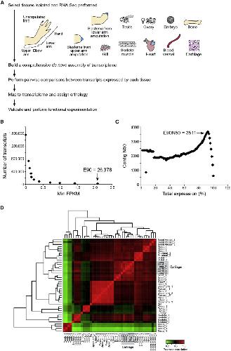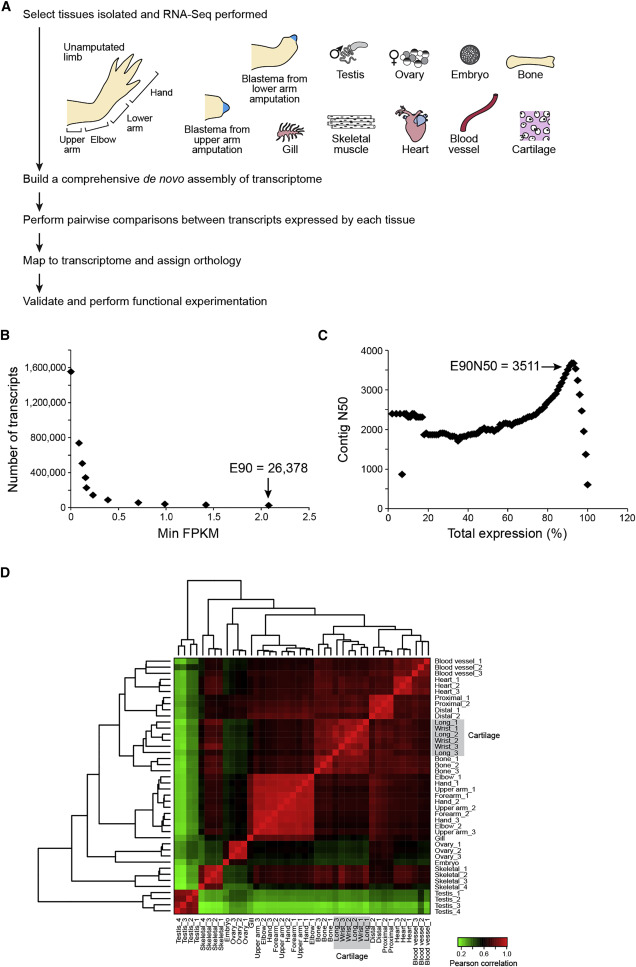 Figure 1. Pipeline and Assessment of Read Representation for De Novo Axolotl Transcriptome (A) Strategy for deriving a tissue-coded de novo transcriptome for axolotl. (B) The count of the most highly expressed transcripts is plotted as a function of minimum expression value. 90% of the total expression (E90) is accounted for by the 26,378 most highly expressed transcripts. FPKM, fragments per kilobase of transcript per million mapped reads. (C) The contig N50 value is computed for cumulative sets of the most highly expressed transcripts. (D) Expression values for all tissue types were compared and Pearson correlation values were computed. Samples were clustered according to Pearson correlation values, indicating high similarity among sample replicates and between similar tissue types. See also Figure S1, Table S1, and Data S1, S2, S3, S4, and S5. |