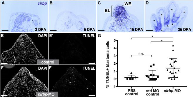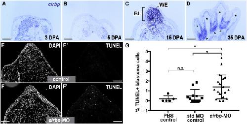 Figure 4. Axolotl Cold-Inducible RNA-Binding Protein Is a Cytoprotective Factor for Blastema Cells (AâD) In situ hybridization for cirbp over the course of regeneration in regenerating limb tissue sections. (A) Three days post-amputation. (B) Five days post-amputation. (C) 15 days post amputation. (D) 35 days post-amputation. Asterisks denote newly differentiated cartilage in digits; arrowheads denote interdigital regions. WE, wound epidermis; BL, blastema; mus, muscle; epi, epidermis; cart, cartilage; n, nerve. Scale bars, 500 μm. (EâFâ²) Tissue sections from regenerating limbs treated with standard morpholinos (MO) control (E and Eâ²) and cirbp-targeting morpholino (F and Fâ²) stained for nuclei (DAPI; E and F) and TUNEL (Eâ² and Fâ²). Scale bars, 500 μm. (G) Quantification of the percentage of TUNEL+ blastema cell nuclei in control and cirbp-MO-treated limbs. âp < 0.05; n.s., not significant. See also Figure S2 and Data S1, S2, and S3. |