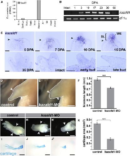 Figure 5. kazald1, the Most Robust Blastema Marker, Is Required for Limb Regeneration (A) Differential tissue expression analysis identifies kazald1 as the most blastema-enriched transcript compared to all other tissues sequenced. (B) RT-PCR performed on blastema cDNA samples throughout the course of regeneration for kazald1 expression. kazald1 was not detected in intact limbs and at 1 DPA, and has dramatically diminished by 60 DPA. (C) In situ hybridization for kazald1 in the blastema over the course of regeneration (top panels). Kazald1 is not detectable in regenerated limbs (35 DPA), intact limbs, or developing limb buds (lower panels). (D–F) Regenerating limbs at 19 DPA treated with control (D) or kazald1-targeting morpholino (E); quantified in (F). (G–J′) Regenerating limbs at 28 DPA treated with control (G) or kazald1-targeting morpholino (H and H′). (I–K) Same specimens stained with Alcian blue to visualize cartilage; (I) is the skeletal preparation of the limb shown in (G); (J) is the skeletal preparation of the limb shown in (H); (J′) is the skeletal preparation of the limb shown in (H′). Not that (G) and (I) are a control, while (H) and (J) and (H′) and (J′) are specimens treated with kazald1-targeting morpholino. Results are quantified in (K). Scale bars, 500 μm (C) and 1 mm (D, E, and H–J′). ∗∗∗p < 0.001. Error bars are SEM. Arrowheads mark the amputation plane in each image. See also Figures S4–S6 and Data S1, S2, S3, S4, and S5. |