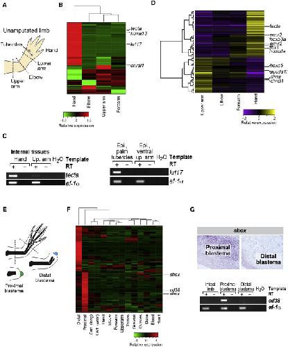Transcripts Differentially Expressed in Proximal versus Distal Elements (A) Schematic illustrating specific elements of the hand and arm. (B) Differential gene expression analysis identifies transcripts that are enriched in distinct sections of the intact limb. (C) RT-PCR validation of select transcripts identified by differential expression analysis. (D) Gradient gene expression analysis identifies transcripts enriched in a gradient from proximal to distal or distal to proximal. (E) Schematic illustrating amputation planes for sampling of proximal and distal blastemas. (F) Differential expression analysis identifies transcripts that are enriched in proximal versus distal blastemas. (G) In situ and RT-PCR validation of computational predictions of differentially expressed transcripts in proximal and distal blastemas. See also Figure S7, Table S5, and Data S1, S2, S3, S4, and S5. |