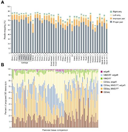 Figure S1. Transcriptome read representation and comparison of methods for differential gene expression analysis. Related to Figure 1 and Table 1. (A) Approximately 80% of RNA-Seq reads from each sample and replicate are represented by the transcriptome assembly. (B) Most transcripts identified as significantly differentially expressed were agreed upon by at least two different computational methods. |