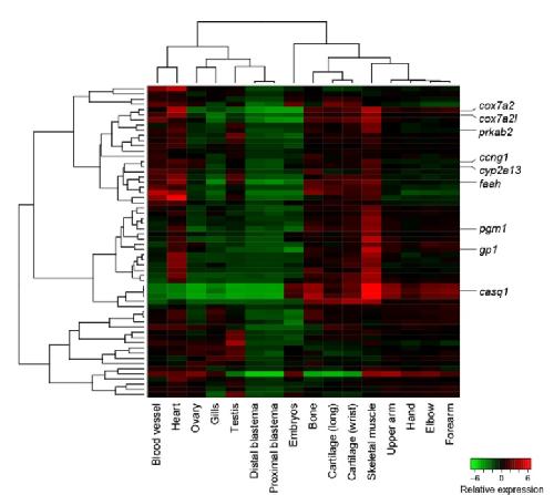 Genes referenced: acta1 cartpt casq1 ccng1 cirbp cndp1 col5a1 cox7a2 cox7a2l ctsk cyp2a13l faah gpa33 gpc6 hipk3 kazald1 klhl41 marveld2 muc1 myc nfyb pgm1 prkab2 rnf8 rnps1 slc37a4 tpm1 trappc5 trdn ttn