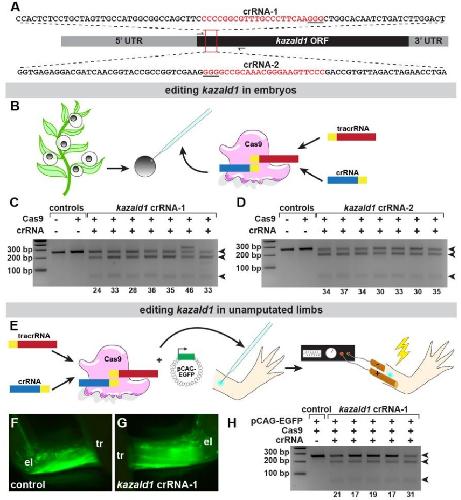 Figure S5. CRISPR-mediated deletions in kazald1 locus in embryos and unamputated limbs. Related to Figure 5. (A) Kazald1 genomic locus and targeting scheme. Primers for PCR amplification for genotyping are indicated. (B) Experimental schematic for targeting in embryos via injection. (C-D) Embryo genotyping via PCR followed by T7 endonuclease assay for embryos injected with crRNA-1 (C) and crRNA-2 (D). (E) Experimental schematic for targeting in unamputated limbs via electroporation. (F-G) EGFP expression in control (F, left limb) and crRNA-1-treated (G, right limb) limbs at 25 days post-electroporation. Landmarks: el (elbow), tr (trunk). (H) Limb genotyping via PCR followed by T7 endonuclease assay. For all genotyping, each lane indicates an individual specimen. Editing efficiency is estimated by the indel percentage beneath each lane. |