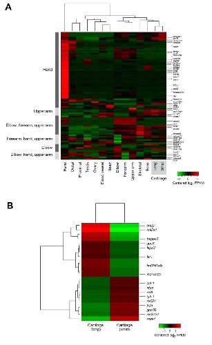 Figure S7. (A) Expression of arm-gradient enriched transcripts across all tissue types. Related to Figure 2 and Figure 6. Many arm segment enriched transcripts have transcriptional enrichment that largely reflects the tissue composition, such as relative skeletal muscle or cartilage content. Hand stands out as having a unique transcriptional program with many hand-specific transcripts being expressed. (B) A paucity of differentially expressed transcripts identified between wrist and long bone cartilage. Differences in expression between these two tissue types are subtle, and this bulk analysis of these two very similar tissue types likely simply lacks the resolution required to reveal key molecular differences between them. |