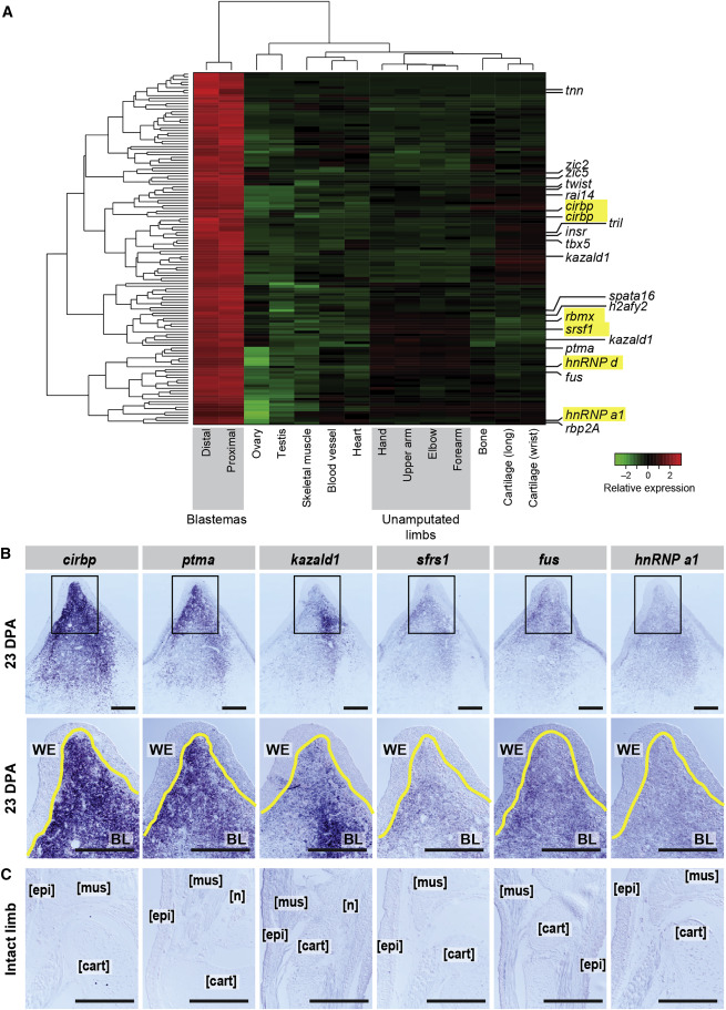 Figure 3. Identification and Validation of Blastema-Enriched Transcripts (A) We identified 159 transcripts (151 genes) enriched in the blastema (the combination of proximal and distal blastema tissue) as compared to all other tissues. Those predicted to encode proteins with RNA-binding/regulation properties are highlighted in yellow. (B and C) In situ hybridization for six highly blastema-enriched transcripts at 23 days post-amputation (DPA (B) and on intact limbs (C). (B) Lower: higher magnifications of the boxed areas (upper). Yellow lines mark the WE/BL boundary. WE, wound epidermis; BL, blastema; mus, muscle; epi, epidermis; cart, cartilage; n, nerve. Scale bars, 500 μm. See also Figure S3, Table S4, and Data S1, S2, S3, S4, and S5. |