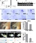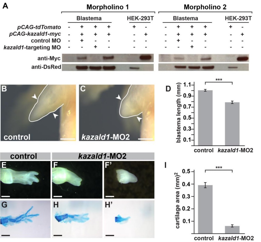 Figure S4. Administration of kazald1-targeting morpholinos diminish Kazd1 protein level in blastema cells and a second kazald1-targeting morpholino also disrupts regeneration. Related to Figure 5. (A) Shown are western blots probed with anti-myc (top) and anti-DsRed (bottom). Left blot is control morpholino (MO) and kazald1-targeting MO for targeting sequence 1, right blot is control MO2 and kazald1-targeting MO2; left four lanes are protein samples from limb blastemas electroporated with DNA constructs shown and with the kazald1-targeting MO or the related control MO (inverted sequence). Empty lane separates blastema samples from 293T cell samples. 293T cell protein samples transfected with individual DNA constructs were used as the positive controls and to verify size. (B-D) MO2 administration impairs blastema growth. (B-C) Regenerating limbs at 19 days postamputation treated with control (B, inverted MO2 sequence) or a second kazald1-targeting morpholino (kazald1- MO2) (C); quantified in (D). (D-H) MO2 administration causes a delay in chondrification. (D-G’) Whole-mount brightfield images (top row, E-F’) of regenerating limbs with Alcian blue-stained skeleton pictured below (G-H’). Limbs were harvested at 28 days post-amputation. (I) Quantification of cartilage area in control versus kazald1- MO2-treated. Control refers to inverted MO sequence. Scale bar is 1 mm. *** indicates p<0.001 and error bars are SEM. Arrowheads mark amputation plane in each image. |