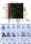 Figure 2. Differential Gene Expression Analysis across Each Set of Tissues Identifies Transcripts Most Enriched in Specific Tissue Types (A) Graph illustrating the methodology for the identification of genes that are tissue enriched in the context of all tissue pairwise comparisons using kazal-type serine peptidase inhibitor domain 1 (kazald1) as an example. Directed edges are drawn from upregulated to downregulated tissues, and fold changes in expression are indicated by edge colors. (B) Heatmap showing all transcripts that are enriched in specific tissue types. (C–J) RNA in situ hybridization performed on tissue sections. (C) speriolin (spatc1) is enriched in the germ cells in the testes but is not detectable in adjacent support cells (asterisks). (D) tropomyosin 1 (tpm1) is enriched in cardiomyocytes within the heart and not detectably expressed by other heart cell types such as epicardium (asterisks). (E) titin (ttn) is enriched in limb skeletal muscle but is not detectable in adjacent cartilage (cart) and epidermis (epiderm). (F) kelch repeat and BTB domain-containing protein 10 (klhl41) is highly enriched in skeletal muscle and not detectable in adjacent tissues such as epidermis (epiderm) and fascia. (G) actin, alpha 1, skeletal muscle (acta1) mRNA is enriched in the very thin layer of vascular endothelial cells lining the blood vessels (arrowheads) and absent from adjacent dermis (derm). Asterisks mark red blood cell clumps in the vessel lumen. (H) collagen type V alpha 1 (col5a1) expression is highly enriched in cartilage; shown are four carpals (outlined) within the wrist. Expression in joint (between carpals) and adjacent muscle is diminished. (I) A bone-enriched marker, cathepsin k (ctsk), is highly expressed in ossified portions of the humerus and low in adjacent muscle. (J) platelet-binding protein GspB (gspb) and mucin 1 (muc1) are detected in cartilage but not in bone by RT-PCR. eukaryotic translation elongation factor 1 alpha 1 (ef-1a) serves as the loading control. Scale bars, 100 μm. See also Figure S7, Tables S2 and S3, and Data S1, S2, S3, S4, and S5. |