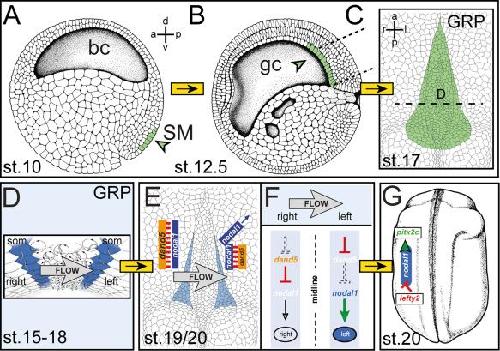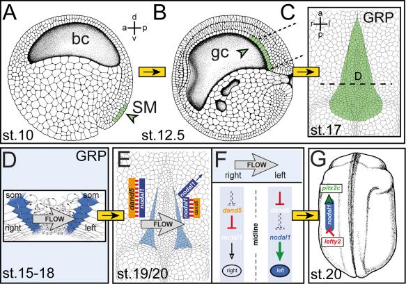 Figure 4. Cilia- and leftward flow-driven mode of symmetry breakage in Xenopus. (AâC) The ciliated GRP develops from the superficial mesoderm (SM), which expresses the motile cilia transcription factor foxj1, and which invaginates during gastrulation. (DâG) Polarized cilia at the center of the GRP produce a leftward flow of extracellular fluids (D), which represses the Nodal inhibitor dand5 in the lateral GRP cells (E) to de-repress the co-expressed Nodal (F) and induce the asymmetric Nodal signaling cascade in the leftLPM (G)
