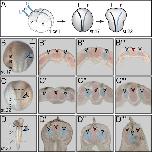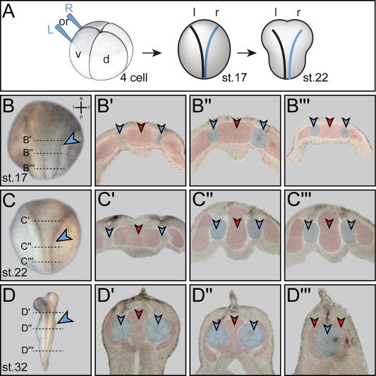Figure 2. Thoracopagus Xenopus twin tadpoles. (A) Thoracopagus conjoined twins in Xenopus laevis can be generated by injection of Wnt-pathway components into the ventral marginal zone of cleavage stage embryos. Depending on whether left or rightventral blastomeres are injected, the induced twins are placed on the left or right side of the endogenous twin. (BâC) Genesis of conjoined twins. Histological vibratome sections of st. 17 (BââBâââ), st. 20 (CââCâââ) and st. 32 (DââDâââ) conjoined twins (BâD) demonstrate the thoracopagus character of twins. At stage 17 and 22, two separate notochords are present throughout (filled arrowheads), which fuse at the posterior end during tadpole stages (Dâââ, st. 32). Normal sized somites are present lateral to both notochords and a large fused somite in between (open arrowheads in BââBâââ, CââCâââ, Dâ, Dââ). Blue shading, notochord; pink shading, somites