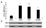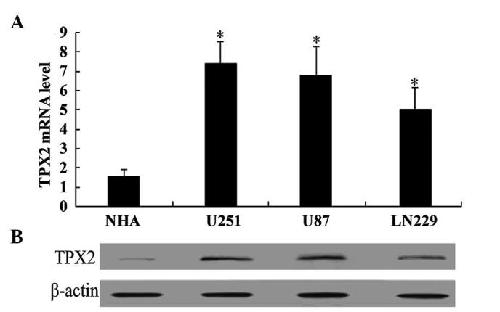 Figure 1. TPX2 expression in primary NHAs and glioma cell lines. (A) TPX2 mRNA expression in primary NHAs and in and glioma cell lines (U251, U87 and LN229) was assessed by RT-qPCR. RT-qPCR revealed that TPX2 was upregulated in all the glioma cell lines compared with the NHA cells. *P<0.05 vs. NHAs. (B) TPX2 protein expression in primary NHAs and glioma cell lines (U251, U87 and LN229) was detected by western blotting. NHA, normal human astrocyte; TPX2, targeting protein for Xenopus kinesin-like protein 2; mRNA, messenger RNA; RT-qPCR, reverse transcription-quantitative polymerase chain reaction.