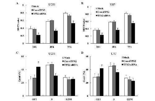 Figure 5. TPX2 knockdown suppresses cell proliferation in U251 and U87 cells. (A and B) TPX2 knockdown significantly suppressed the proliferation of (A) U251 and (B) U87 glioma cells at different time points. (C and D) TPX2 knockdown resulted in an increased number of (C) U251 and (D) U87 glioma cells in G0/G1 phase and a reduced number of cells in S phase. Data are the mean + standard deviation of three independent experiments. *P<0.05. TPX2, targeting protein for Xenopus kinesin-like protein 2; Con, control; siRNA, small interfering RNA; OD, optical density.