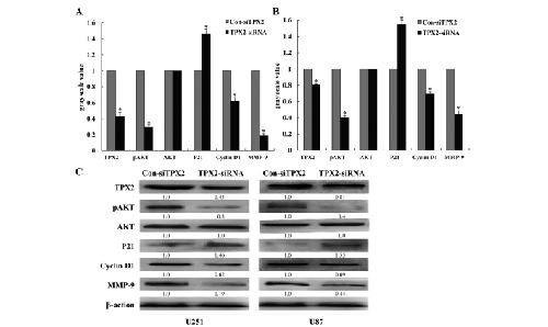 Figure 8. AKT inhibitor IV inhibits TPX2 expression and AKT signaling pathway in (A) U251 and (B) U87 cells. (C) Western blot analysis of TPX2, pAKT, AKT, p21, cyclin D1 and MMP-9 expression following AKT inhibitor IV treatment. β-actin served as the loading control (*P<0.05). TPX2, targeting protein for Xenopus kinesin-like protein 2; MMP, matrix metallopeptidase; p, phosphorylated; Con, control; siRNA, small interfering RNA.