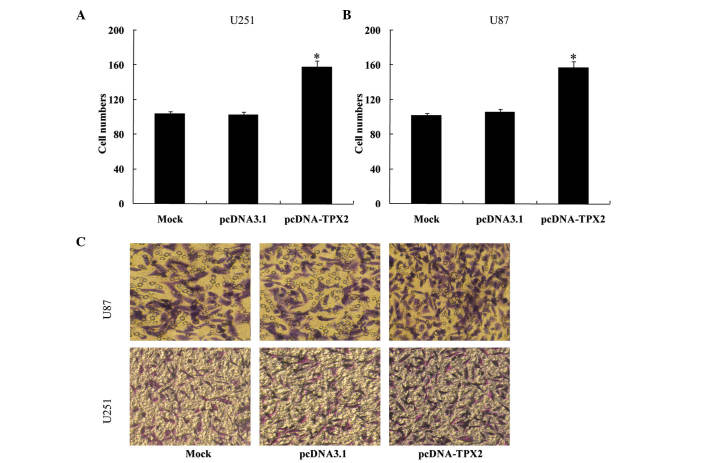 Figure 3. TPX2 overexpression promotes invasion in U251 and U87 cells. (A) U251 and (B) U87 cells were examined for cell invasion in 24-well plates with Transwell chambers. (C) The migrated cells were stained with crystal violet and observed under a light microscope (magnification, ×200). The invasiveness of U251 and U87 cells was enhanced with TPX2 overexpression. *P<0.05. TPX2, targeting protein for Xenopus kinesin-like protein 2.
