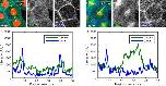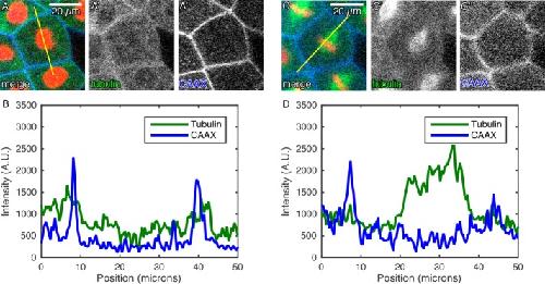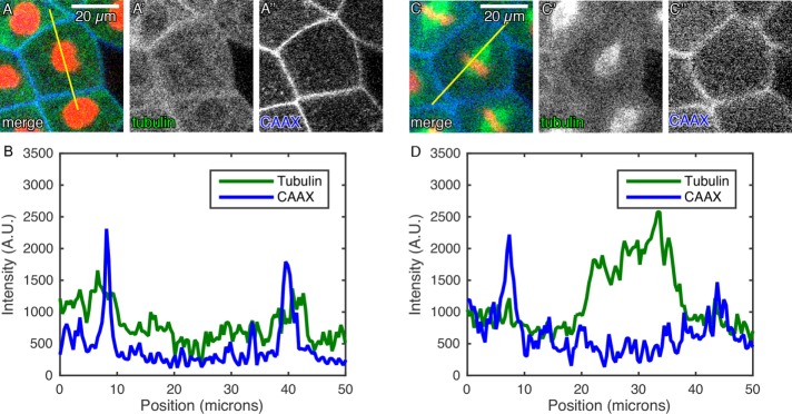 FIGURE 2:. CAAX provides a bright cell-edge marker. (A) Comparison of cortical tubulin and mTagBFP-CAAX (BFP-CAAX, a membrane marker) in interphase cell with accompanying line scan (B) reveals both tubulin and CAAX signal at the cell edge. (C) Comparison of tubulin and membrane probes in mitotic cell with accompanying line scan (D) demonstrates loss of cortical tubulin in mitosis. Cells were labeled through expression of GFP-Tub, mChe-H2B, and BFP-CAAX. |