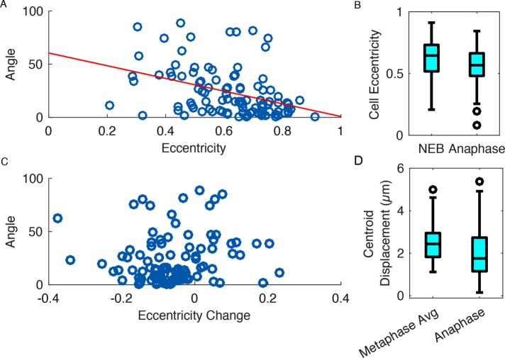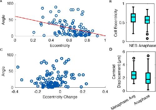 FIGURE 6:. Comparison of cell and anaphase spindle metrics. One hundred cells expressing mChe-H2B, GFP-Tub, and BFP-CAAX were analyzed with the Spindlometer. (A) Comparison of angle between anaphase spindle orientation and NEB cell orientation and cell eccentricity reveals decreased angle as cell eccentricity increases (linear regression fit, slope = â59.6, p < 0.0001). (B) Average cell eccentricity decreased through mitosis (p < 0.0001, paired t test). (C) Angle between spindle and cell orientation is independent of change in cell eccentricity through mitosis (p = 0.24). (D) Comparison of distance between spindle centroid and cell centroid during metaphase and at anaphase onset reveals a significant decrease of displacement (increased spindle centering) at anaphase onset (p = 0.0004, paired t test). |