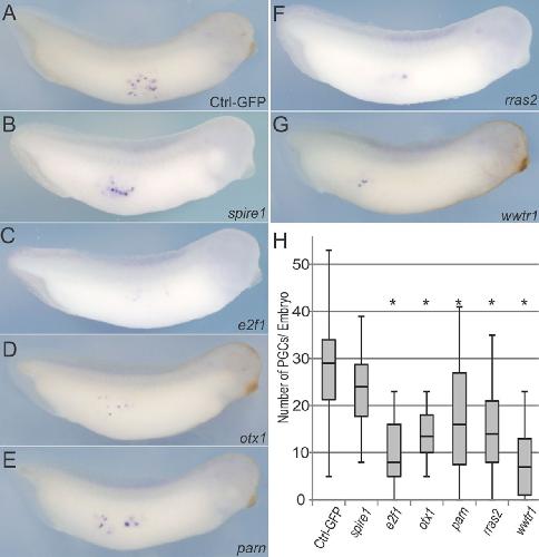 ng). Tailbud embryos (stage 32-35) were analyzed for xpat expression by WISH, and representative images are shown (A-G). The number of PGCs per embryo was quantified (H). GFP, n=16; spire1, n=39; e2f1, n=64; otx1, n=27; parn, n=35; rras2, n=48; wwtr1, n=35. *P<0.05, compared with GFP control. Analysis based on at least two independent experiments and shown as a box and whisker plot. |