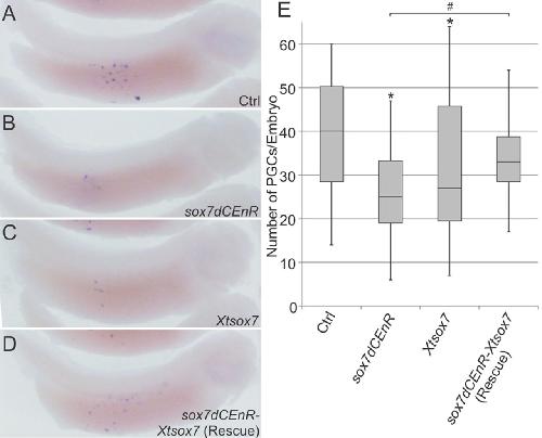 Altering sox7 expression reduces PGC number. One-cell embryos were injected in the vegetal region with sox7dCEnR RNA (200â