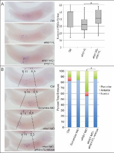 efnb1 is required for normal PGC number and migration. One-cell embryos were injected in the vegetal region with (A) efnb1-FL alone (200â