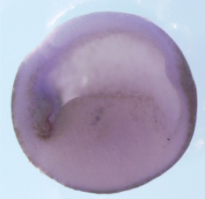 tob2 (transducer of ERBB2, 2) gene expression in bissected Xenopus laevis embryo, assayed via in situ hybridization, NF stage 6, vegetal view |