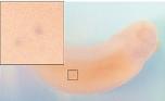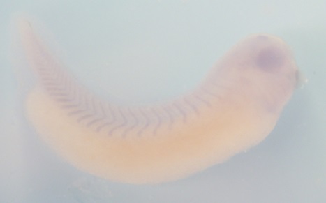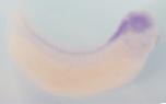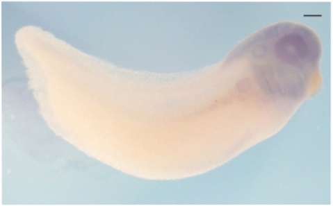 rnf38 ( ring finger protein 38 ) gene expression in Xenopus laevis embryo, assayed via in situ hybridization, NF stage 32, lateral view, anterior right, dorsal up. |