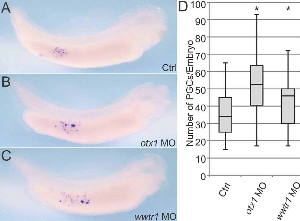ng) targeting otx1 or wwtr1. Tailbud embryos (stage 32-35) were analyzed for xpat. Representative images are shown (A-C). The number of PGCs per embryo was quantified (D). Uninjected control (ctrl), n=32; otx1-MO, n=31; wwtr1-MO, n=25. *P<0.05 compared with control. Analysis based on at least two independent experiments. |