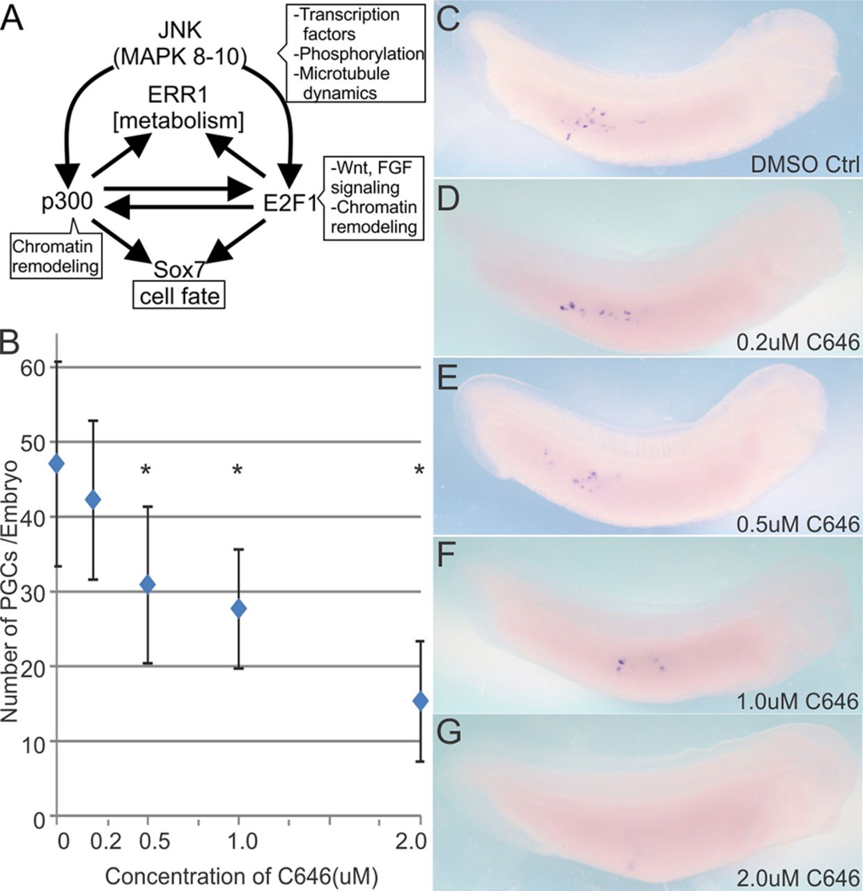 Inhibition of p300 reduces PGC number. (A) Schematic of GeneGo-predicted p300 regulatory interconnections from our data set. (B-G) One-cell embryos were incubated with â¤0.04% DMSO (ctrl, n=31) or increasing concentrations of the p300 inhibitor C646: 0.2â